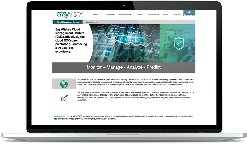 Enterprises are moving applications to the cloud at a rapid pace. To gain agility, reduce operational costs and stay compliant, organisations like yours demand secure, stable, and reliable cloud infrastructure — especially for ITSM. Because ITSM software manages vital business processes, security, transparency, and performance are required. EasyVista's trusted cloud provides all three to make ITSM a new point of success.