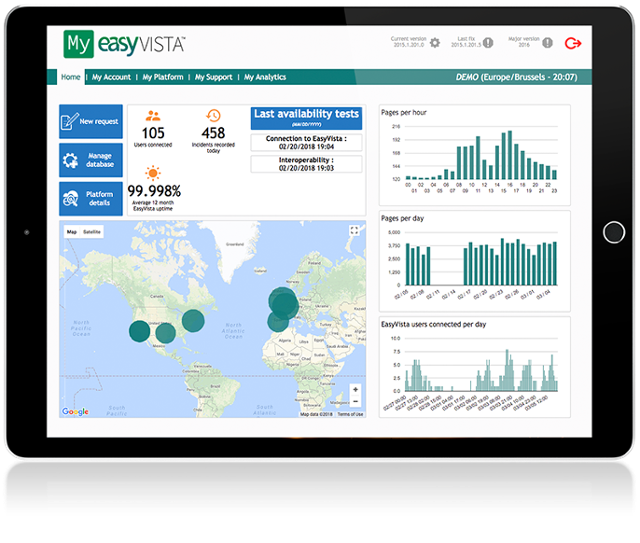 Access the real-time operational statistics you need with a dedicated dashboard portal. Our commitment to full transparency fuels the MyEasyVista.com portal, providing you access to 24/7 real-time system availability and operational statistics specific to your implementation. EasyVista also provides customers with access to our annual SSAE-18 Type 2, SOC 2 Type 2, and SOC 3 Type 2 audit reports. This visibility ensures that you maintain awareness and control of your vital systems.